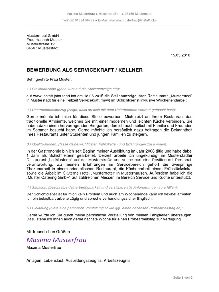 Bewerbungsschreiben als servicekraft im bereich gastronomie service. Bewerbungsschreiben Servicekraft Tipps und Vorlagen für deine Bewerbung Als Servicekraft ist es deine Aufgabe deinen Gästen eine angenehme Zeit mit gutem Essen zu bescheren. Sämtliche Vorlagen auf dieser Seite sind für Servicekraft formuliert und stehen auch als Word-Dokument zum kostenlosen Download bereit. Mustermannmaxmusterde Musterfirma GmbH z.