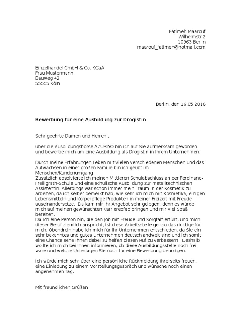 Bewerbung Ausbildung Kfz Mechatroniker Frisches 29 Drogistin. Der Beruf der Drogistin spricht mich an da ich. Vergiss bei deinem Anschreiben den Briefkopf nicht.